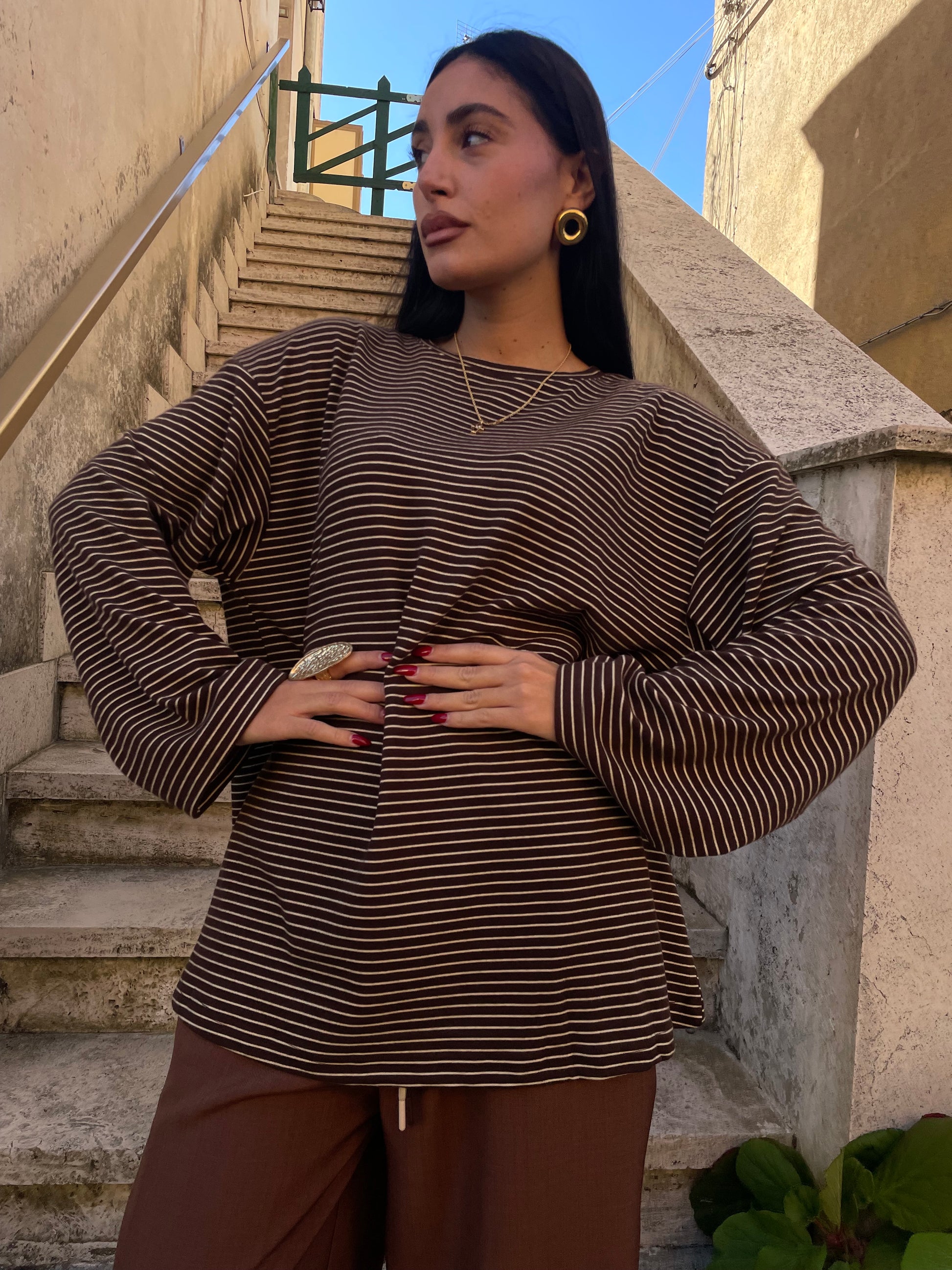 Maglietta vestivilità over size a righe cacao con righina burro